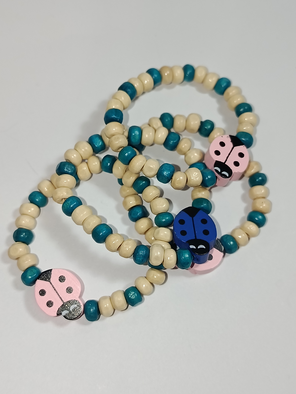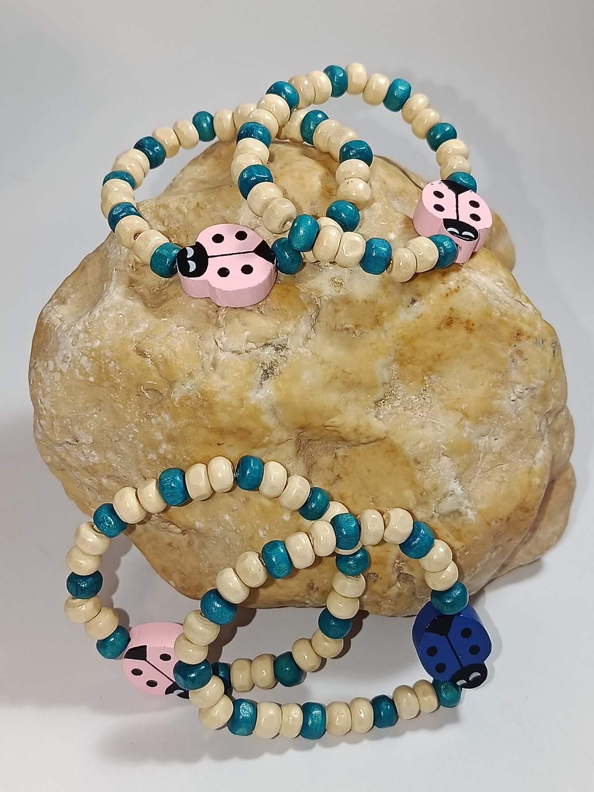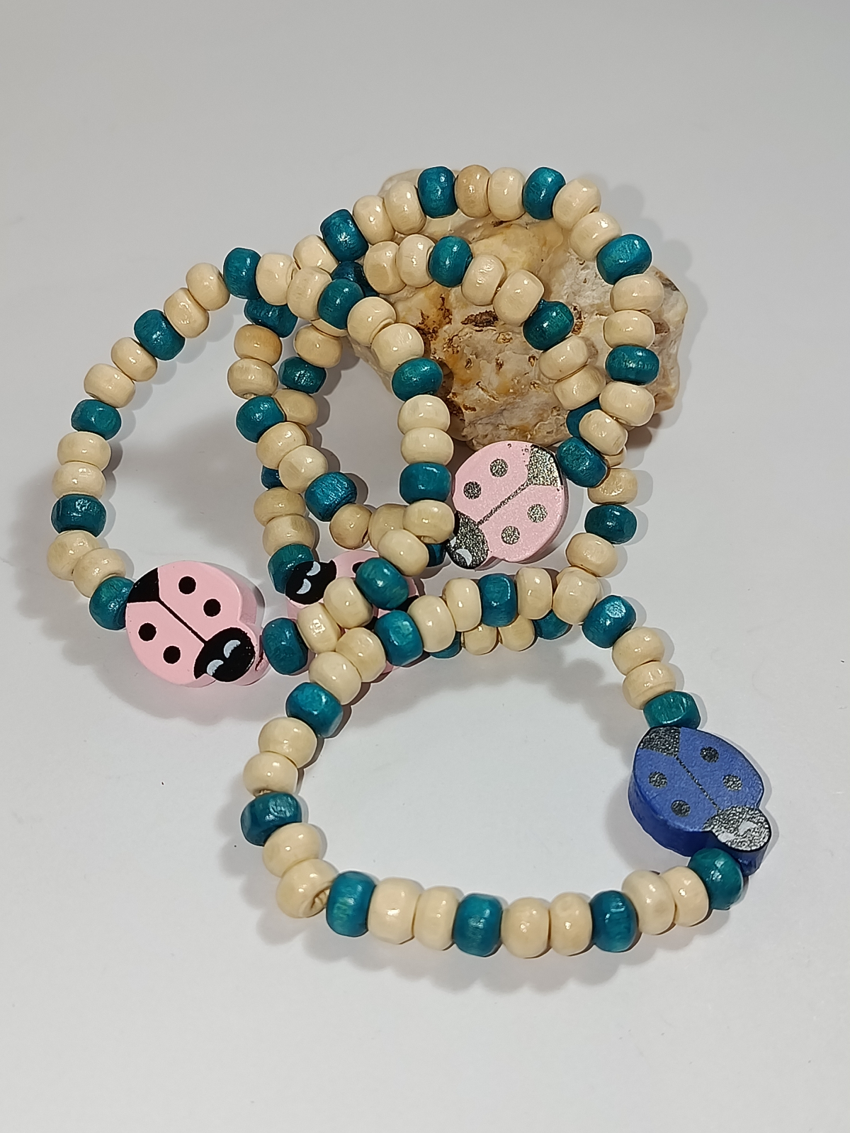 Piesa centrală este un charm gărgăriță din lemn, disponibil în variante cromatice de roz delicat sau albastru intens, simbolizând norocul și renașterea naturii. Cu o dimensiune adaptabilă de 12-14 cm, brățara este montată pe un fir elastic durabil, fiind extrem de ușor de purtat și rezistentă la micile aventuri zilnice ale copiilor. Este alegerea perfectă pentru un mărțișor handmade care îmbină materialele naturale cu un design modern și jucăuș.