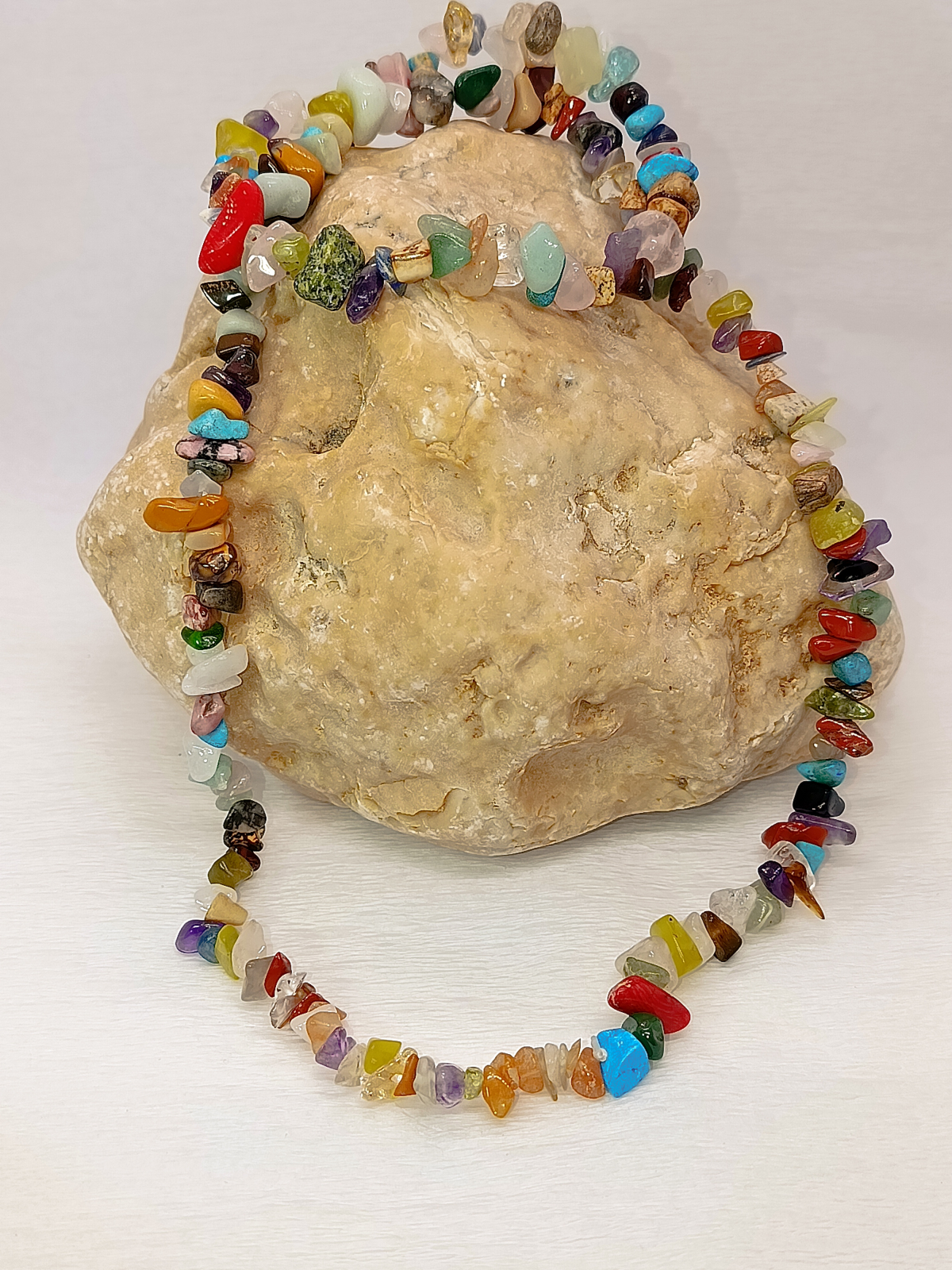 Redă frumusețea și veselia culorilor în ținutele tale cu acest set handmade din pietre mix semiprețioase, realizat cu atenție și pasiune în România. Setul conține un colier de 40 cm și o brățară elastică de 17–19 cm, ambele create manual cu grijă pentru detalii.