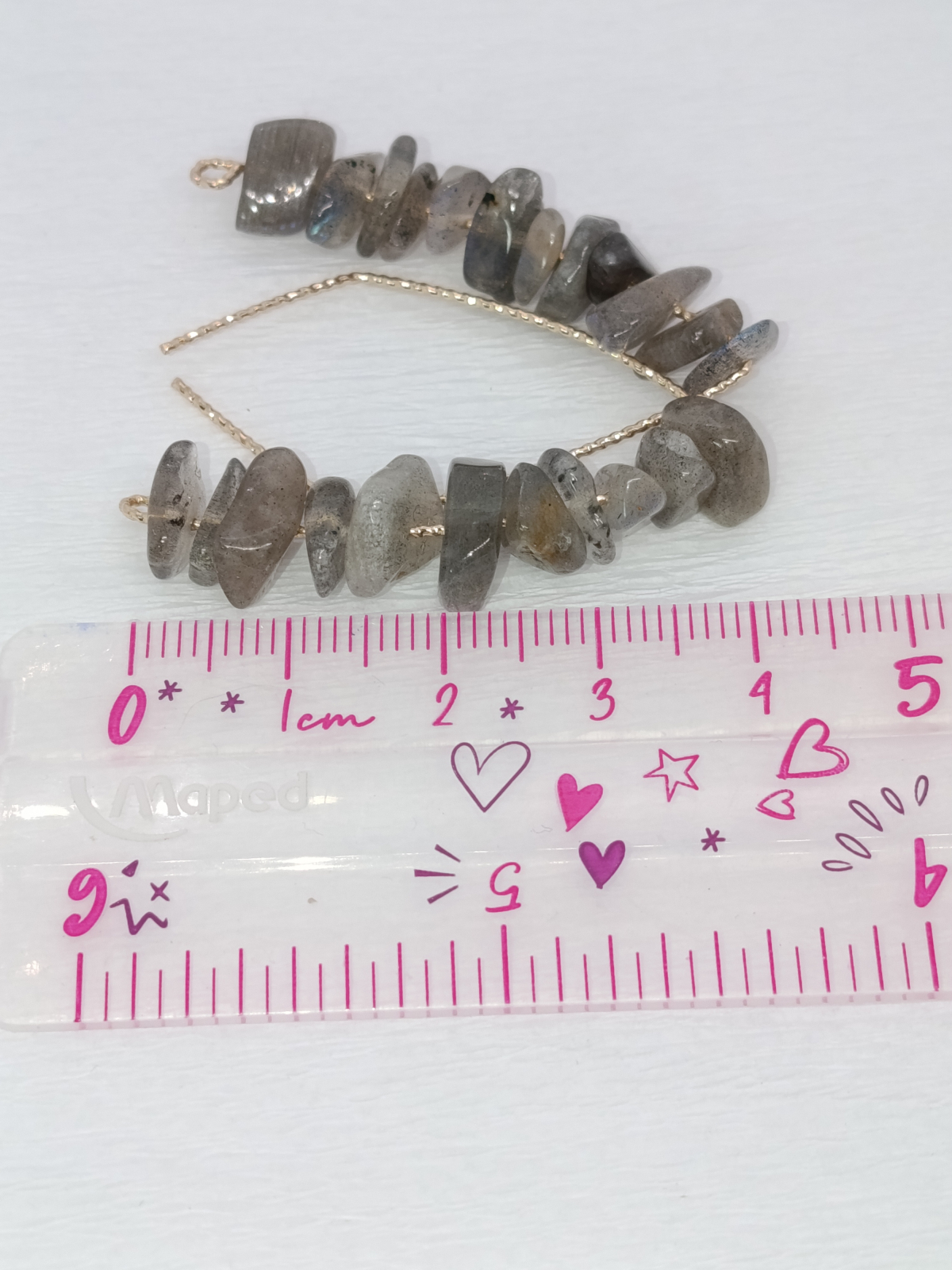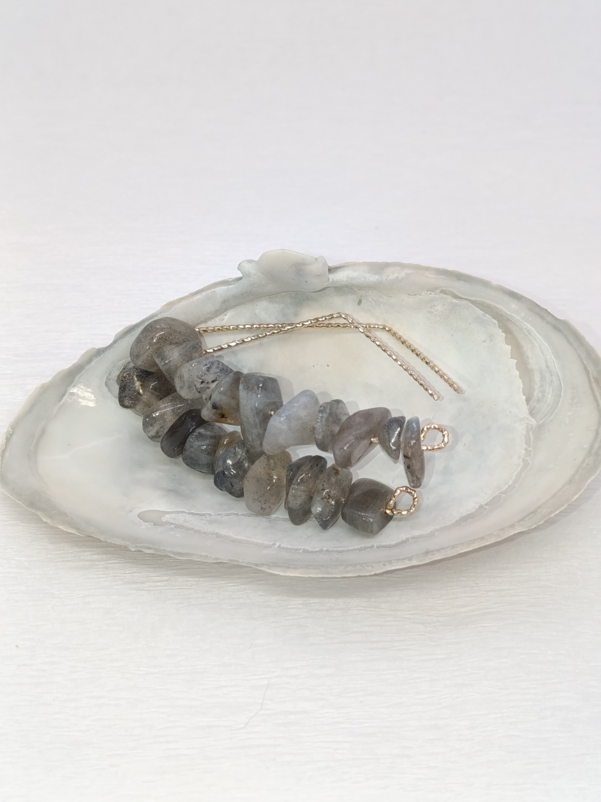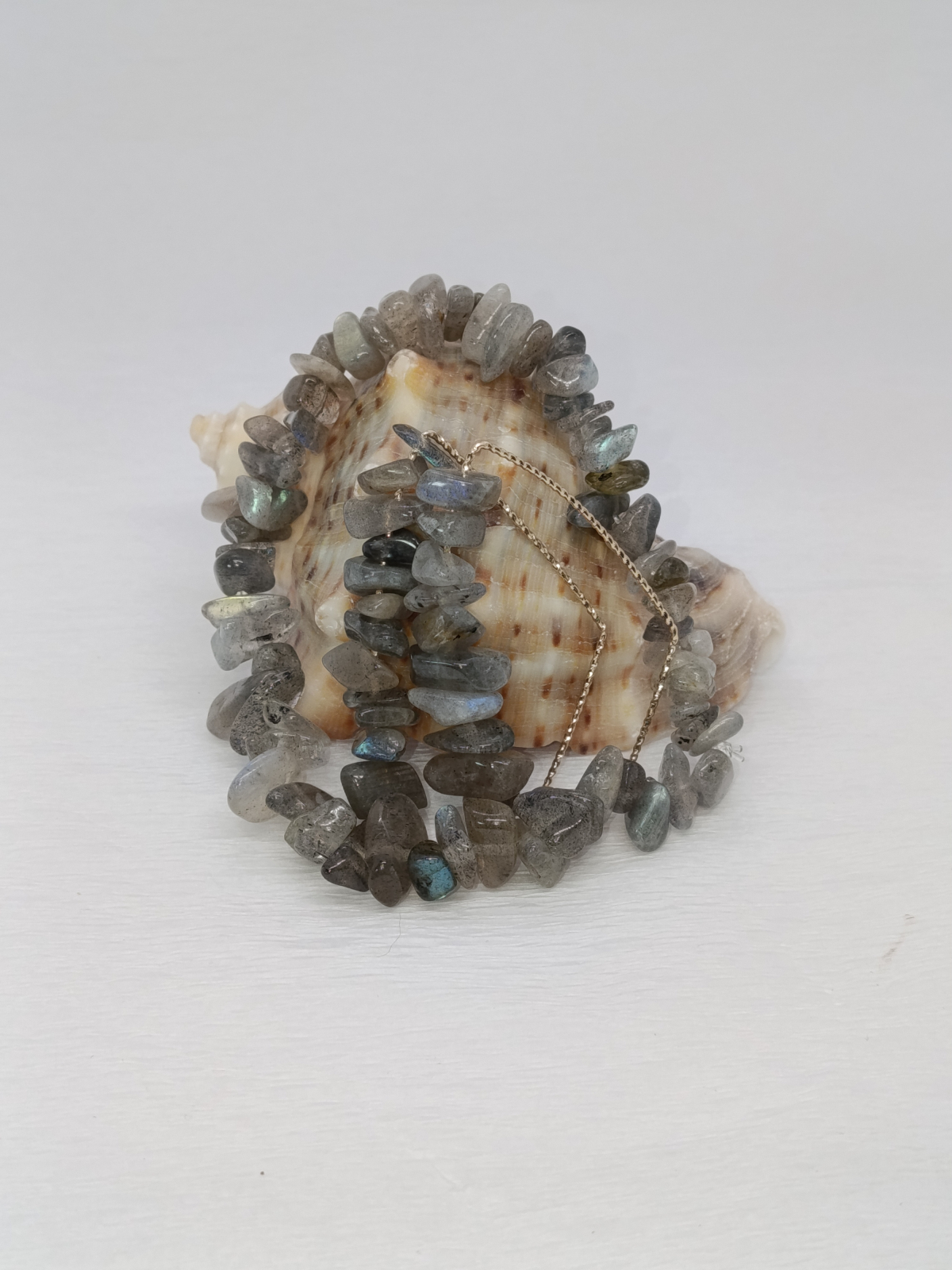 Brățara: Realizată dintr-un șir de pietre de labradorit înșirate pe un elastic rezistent. Pietrele, cu formele lor neregulate, reflectă o paletă subtilă de culori, de la griuri fumurii la nuanțe translucide, care prind viață la cea mai mică mișcare. Cu o lungime de 17-19 cm, brățara este confortabilă și se adaptează perfect pe încheietură.
