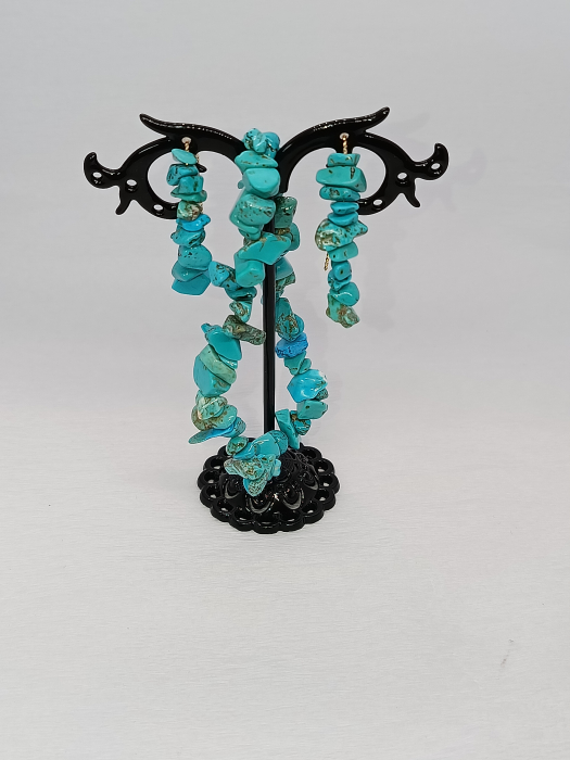 Cerceii: O completare perfectă a brățării, cerceii sunt realizați din pietre de turcoaz montate pe sârmă hipoalergenică. Această alegere a materialului asigură confortul și siguranța chiar și pentru pielea cea mai sensibilă, permițându-ți să te bucuri de frumusețea lor fără griji.