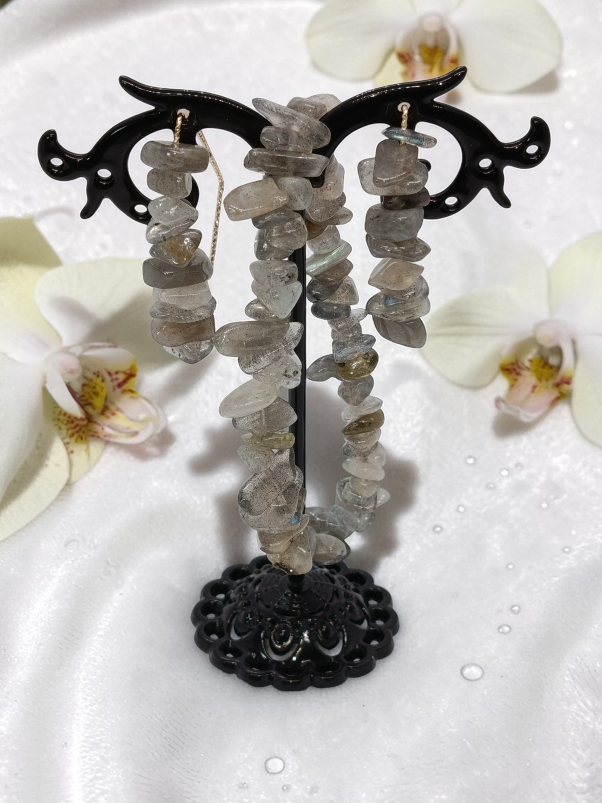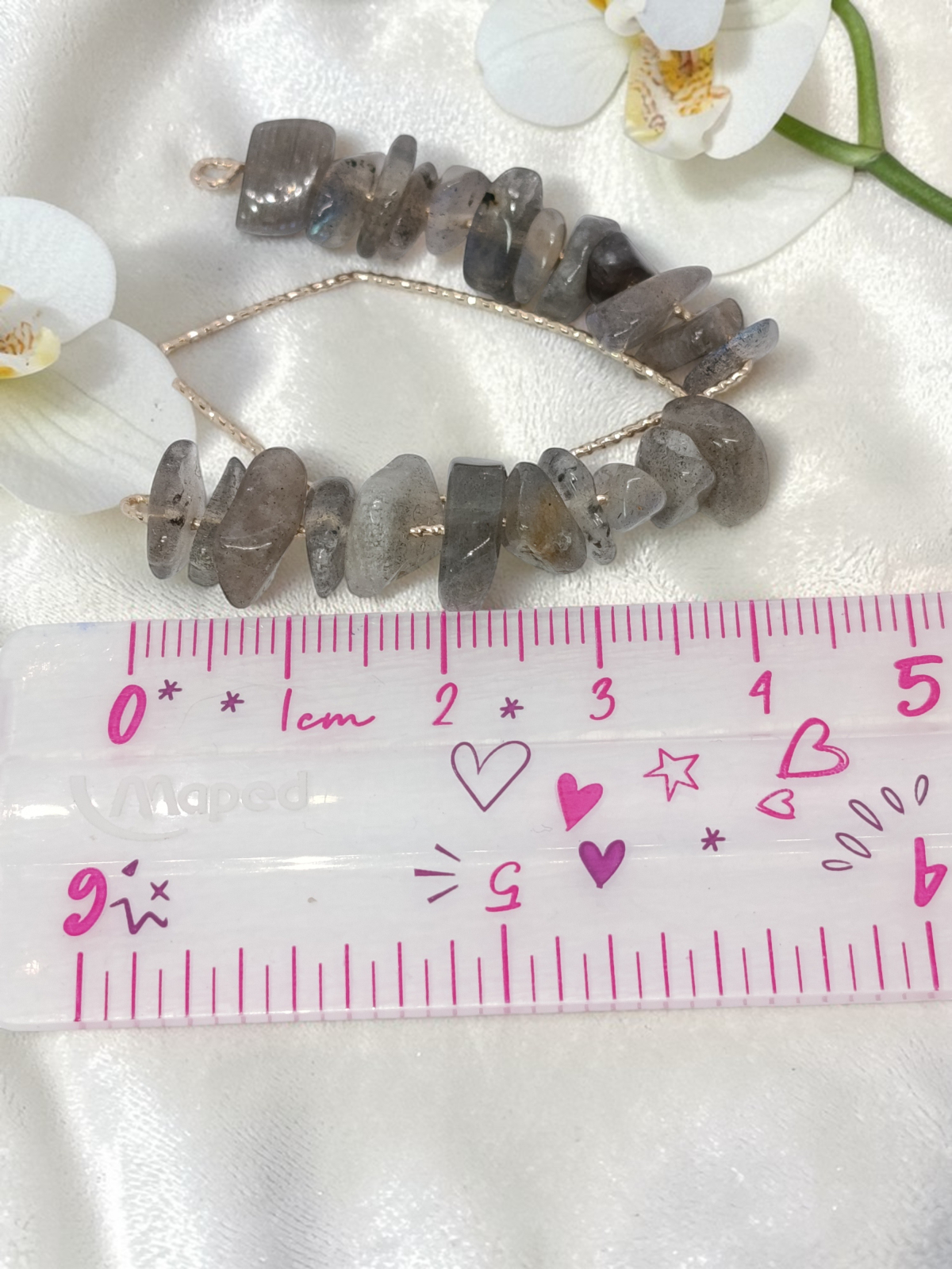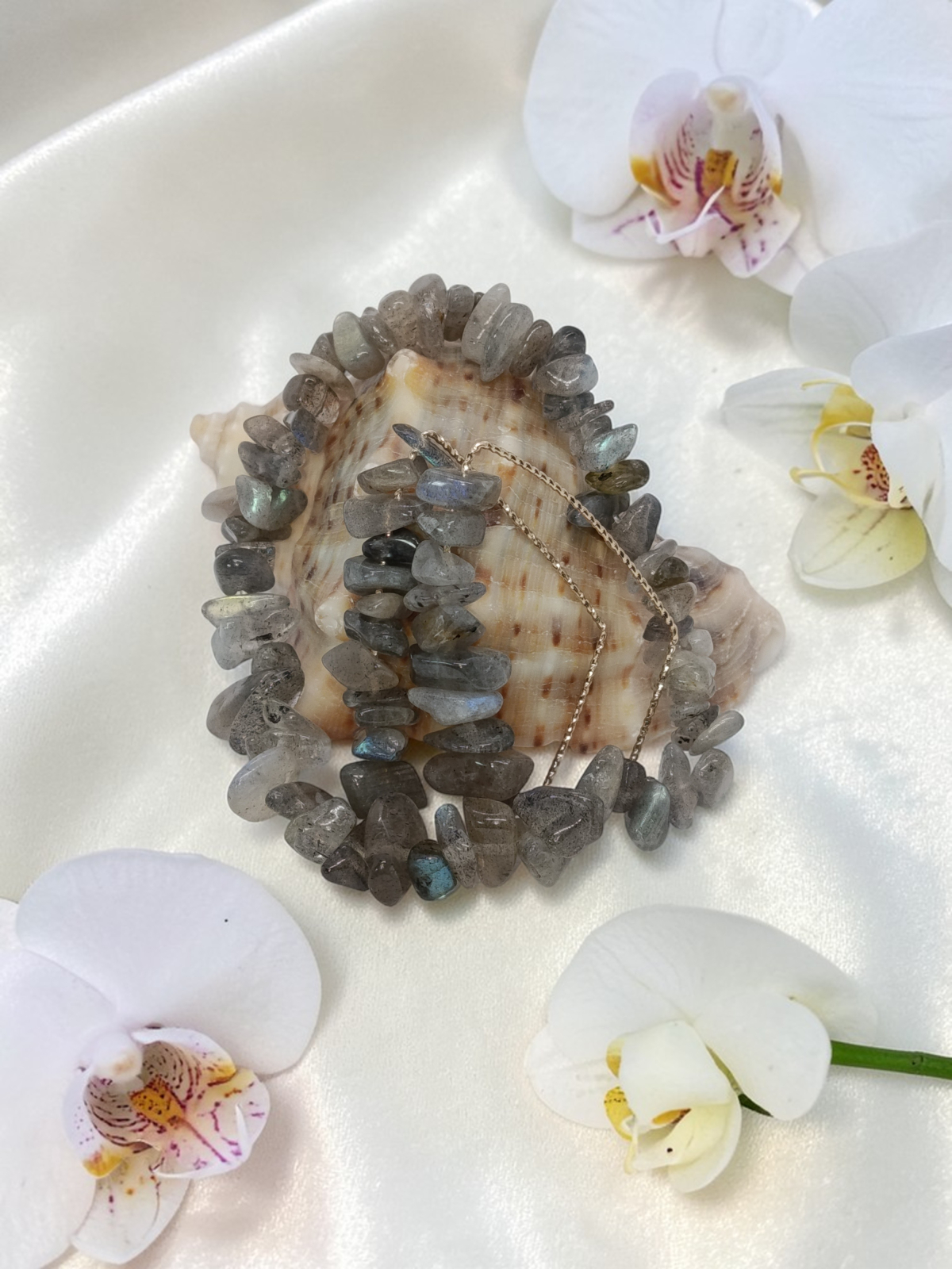 Brățara: Realizată dintr-un șir de pietre de labradorit înșirate pe un elastic rezistent. Pietrele, cu formele lor neregulate, reflectă o paletă subtilă de culori, de la griuri fumurii la nuanțe translucide, care prind viață la cea mai mică mișcare. Cu o lungime de 17-19 cm, brățara este confortabilă și se adaptează perfect pe încheietură.