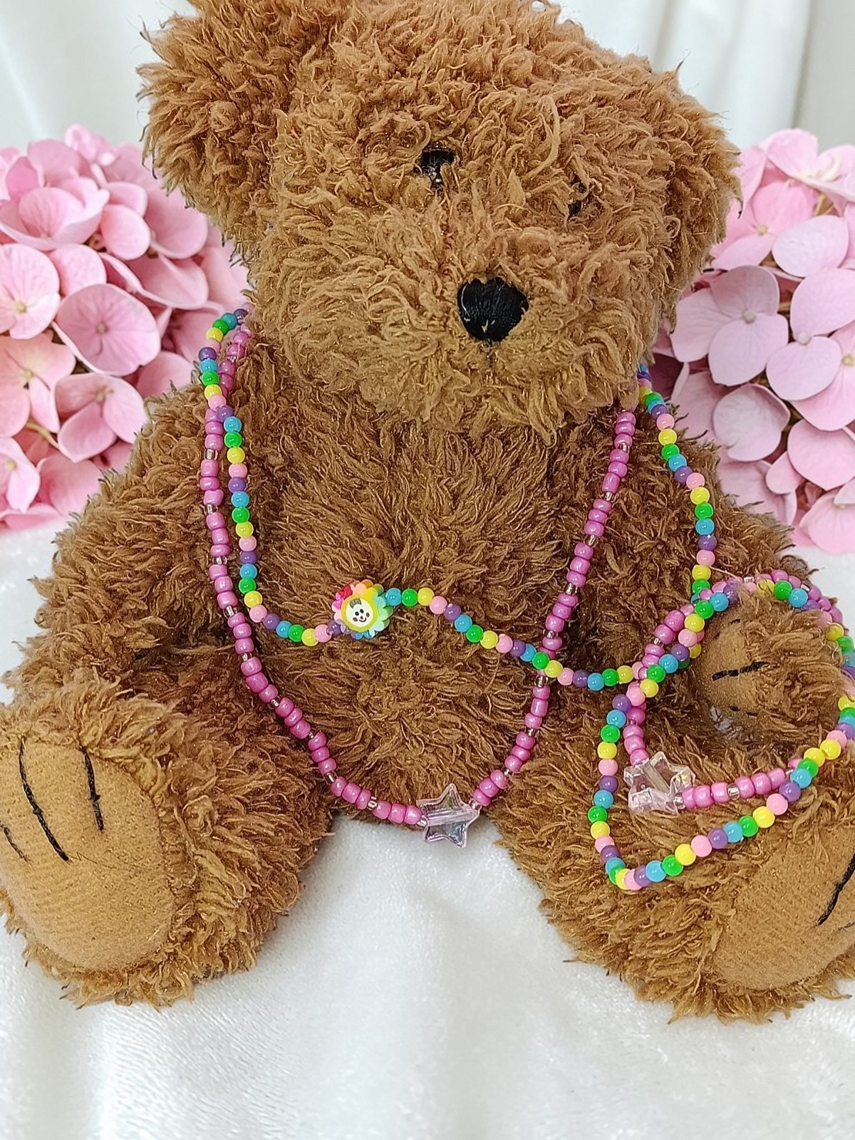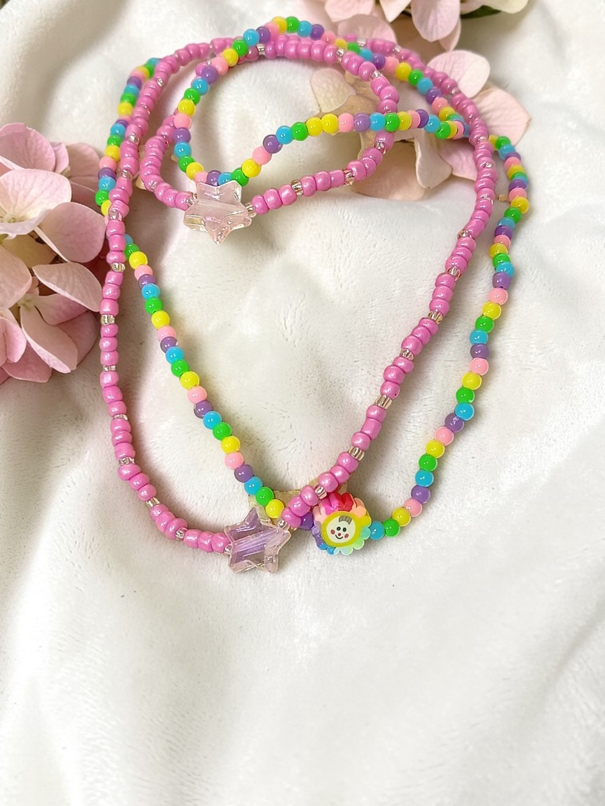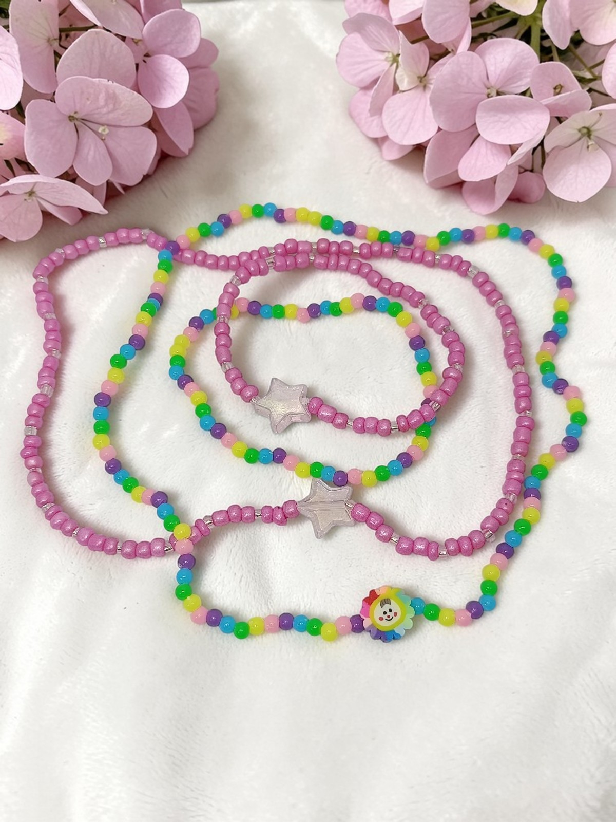 2. O alegere delicată și visătoare, acest set este ideal pentru fetițele care preferă nuanțele subtile și accentele sclipitoare. Combinația de mărgele roz sidefat și roz deschis este elegantă, iar fiecare piesă este accentuată de un medalion fermecător în formă de stea irizantă, adăugând o notă de magie.
